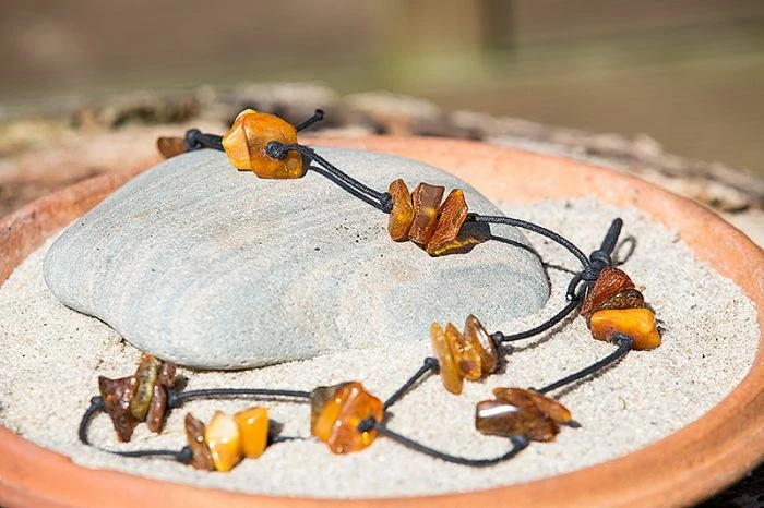Wir verwenden für unsere Ketten Rohbernsteine, die wir anpoliert und mit einer Bohrung versehen haben.