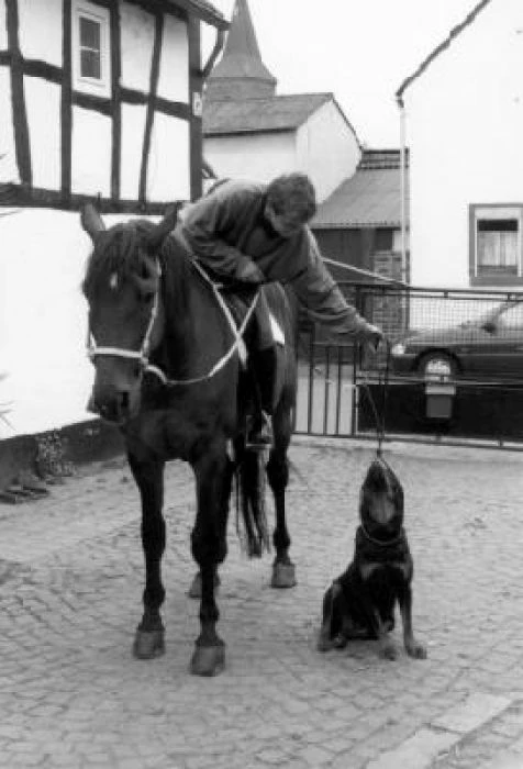 Voraussetzung für den optimalen Gebrauch der Merothischen Reiterleine ist ein harmonisches Zusammenspiel zwischen Reiter, Pferd und Hund. Das heißt Pferd und Hund müssen so aneinander gewöhnt sein, dass beide ruhig nebeneinander stehen (Hund auch sitzend). Zum Anleinen wird die im Systemteil eingebaute Halsschlaufe (die vorher eingestellt wurde) weit geöffnet. Diese legt man dann von oben (Reiterposition) um den Hundekopf. Liegt die Schlaufe um den Hals des Hundes, schließt man die Halsung durch Hochziehen am Führteil. Wichtig ist zu wissen, dass die Halsung kein Würger und keine Schlinge ist. Sie schließt nur so weit, wie Sie es vorher eingestellt haben. Der Hund ist damit angeleint. Das Führteil halten Sie in der Hand oder legen Sie es sich um die Schulter.